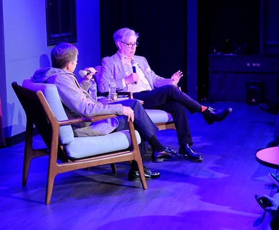 Intimate cabaret-style theater with in-house AV including projector and screen, wireless and wired microphones, comfortable tables and chairs, adjacent private green room, and a presentation ready ADA accessible stage.