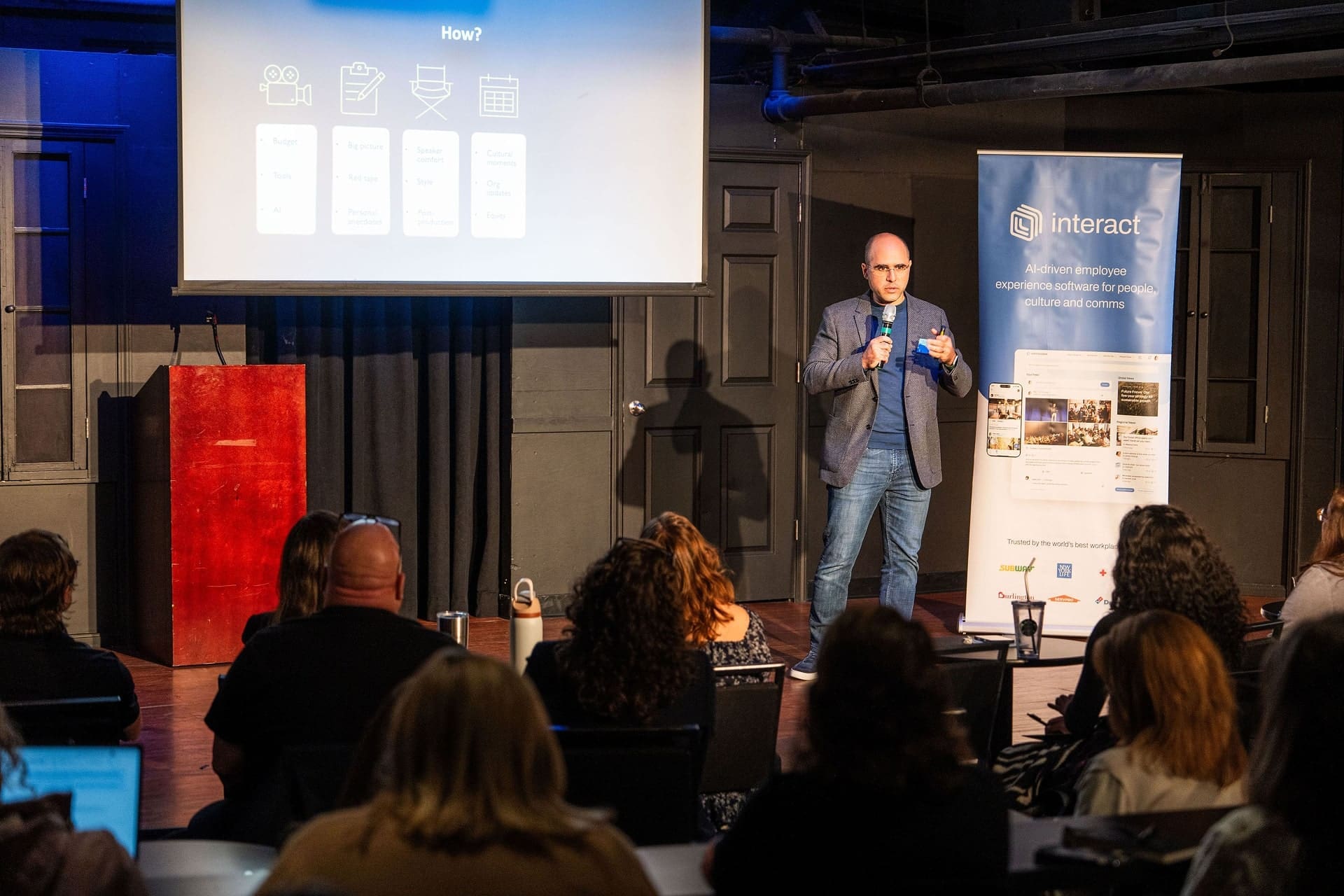 Intimate cabaret-style theater with inhouse AV including projector and screen, wireless and wired microphones, comfortable tables and chairs, adjacent private green room, and a presentation ready stage.
